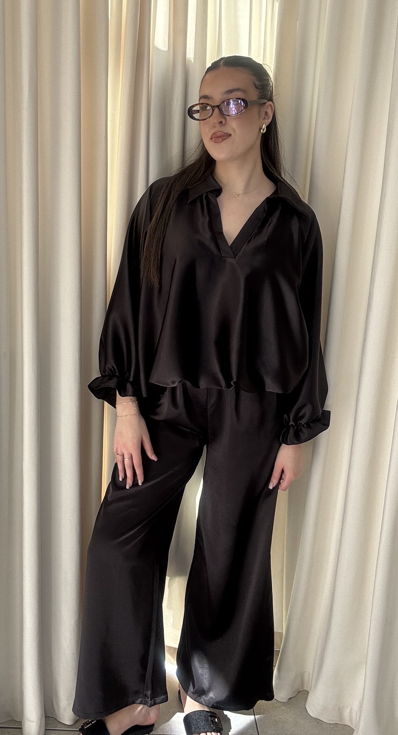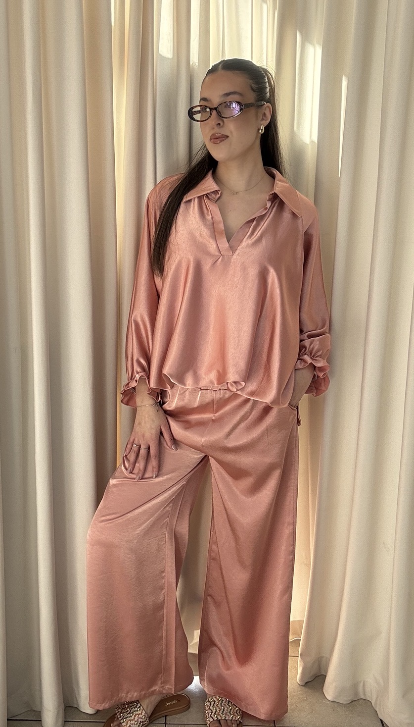 Elegantný saténový komplet v jemnom béžovo-šampanskom odtieni predstavuje dokonalé spojenie pohodlia a nadčasového štýlu. Blúzka má voľný, splývavý strih s dlhými rukávmi zakončenými jemným riasením, ktoré dodáva celku ženský a sofistikovaný vzhľad. Hladký, lesklý materiál pôsobí luxusne a príjemne na dotyk. Nohavice s vysokým pásom a širokými nohavicami krásne predlžujú siluetu a zabezpečujú maximálny komfort pri nosení. Vďaka elastickému pásu sa komplet dokonale prispôsobí postave. Tento set je ideálny na každodenné nosenie aj špeciálne príležitosti – stačí ho doplniť výraznými doplnkami alebo minimalistickými kúskami pre čistý, moderný look.