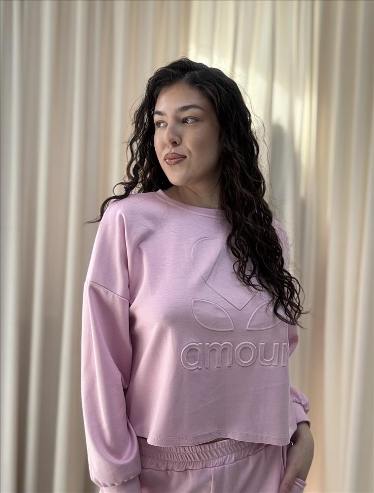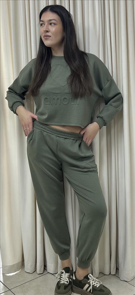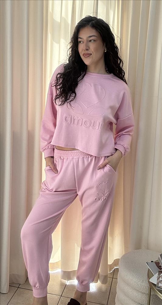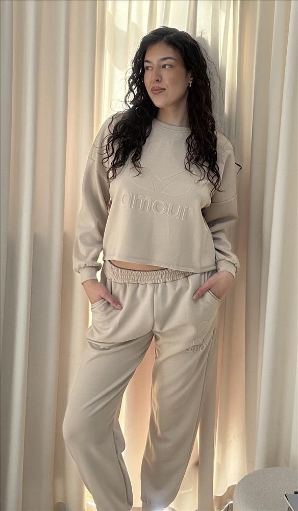 Táto štýlová dámska súprava je ideálnou voľbou pre pohodlné dni doma aj vychádzky. Skladá sa z cropped mikiny a pohodlných teplákov, ktoré spolu vytvárajú moderný a ženský look. Mikina má voľnejší strih s dlhými rukávmi a elastickými manžetami. Prednú stranu zdobí jemne reliéfny nápis „amour“ s minimalistickým motívom srdca, ktorý dodáva kúsku romantický nádych. Skrátená dĺžka mikiny zvýrazní pás a pôsobí trendy. Tepláky majú pohodlný elastický pás a praktické bočné vrecká. Ich strih je mierne zúžený smerom ku členkom, čo zabezpečuje lichotivý a zároveň komfortný fit. Na nohaviciach sa nachádza rovnaký decentný detail srdca a nápisu, ktorý krásne ladí s mikinou. Príjemný, mäkký materiál zaručuje maximálne pohodlie počas celého dňa. Súprava je ideálna na relax, cestovanie alebo voľnočasové aktivity, pričom si zachováva štýlový vzhľad.