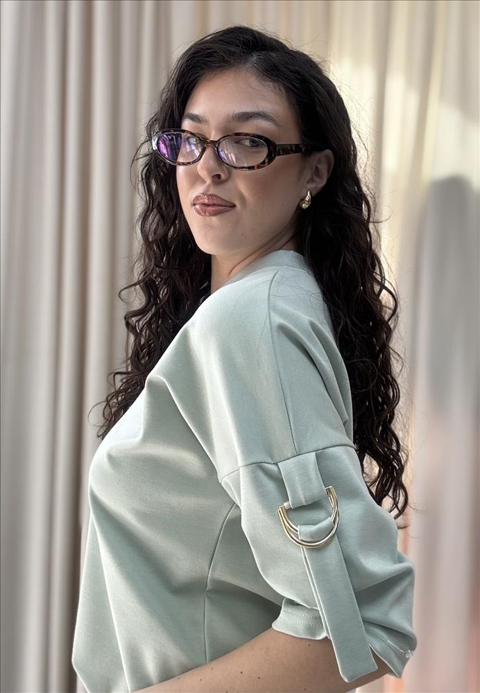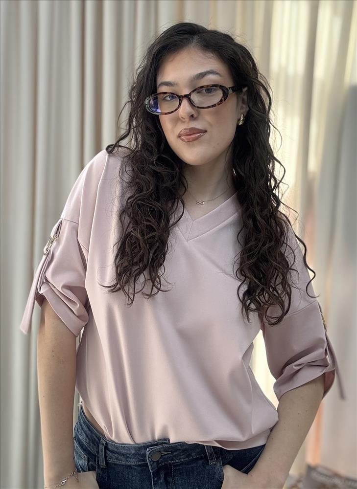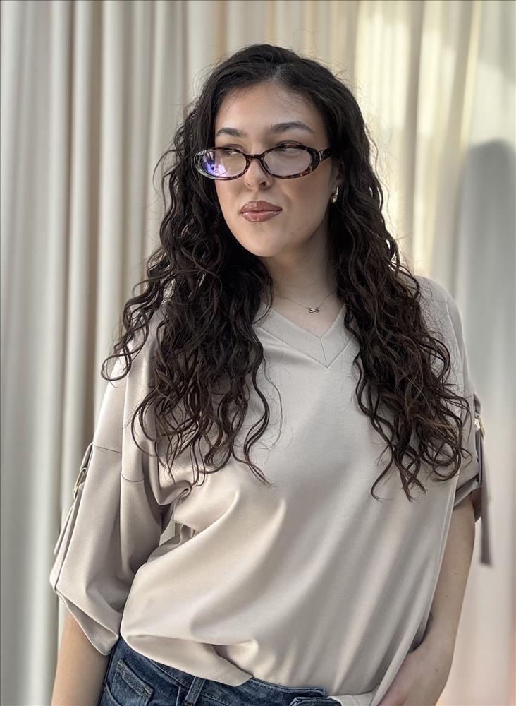 Táto elegantná dámska blúzka v nadčasovej bielej farbe je ideálnym kúskom pre každý šatník. Vyniká svojím minimalistickým dizajnom, ktorý ľahko skombinujete s rôznymi outfitmi – od ležérnych až po formálnejšie. Blúzka má voľnejší, pohodlný strih s výstrihom do „V“, ktorý jemne zvýrazňuje dekolt a dodáva ženský vzhľad. Krátke rukávy sú ozvláštnené štýlovými detailmi – jemným prestrihom a dekoratívnou sponou, ktoré pôsobia moderne a originálne. Materiál je ľahký, príjemný na dotyk a ideálny na celodenné nosenie. Vďaka svojmu univerzálnemu vzhľadu sa blúzka skvele hodí k džínsom, nohaviciam aj sukniam – či už do práce, na stretnutie alebo voľný čas.