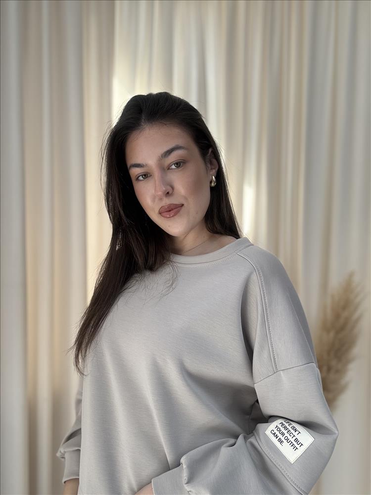 Pohodlný a štýlový dámsky set v minimalistickom dizajne, ideálny na každodenné nosenie aj voľný čas. Set pozostáva z voľnej mikiny a pohodlných teplákových nohavíc, ktoré spolu vytvárajú harmonický a moderný outfit. Mikina má voľný strih s dlhými rukávmi a pružným lemom, čo zaručuje maximálne pohodlie. Nohavice sú vybavené elastickým pásom so šnúrkou na prispôsobenie a ukončené jemným patentom pri členkoch. Príjemný materiál zabezpečuje komfort počas celého dňa, zatiaľ čo neutrálna farba umožňuje jednoduché kombinovanie aj s inými kúskami.