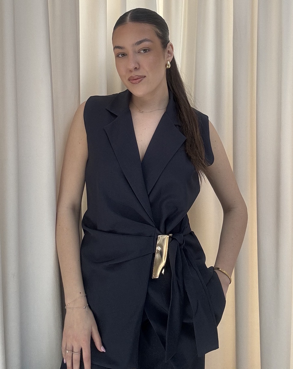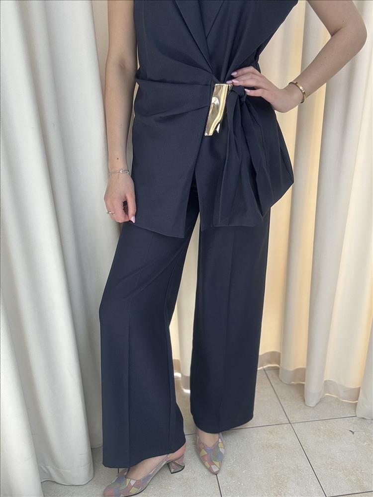Elegantný dámsky komplet v nadčasovej čiernej farbe, ktorý spája sofistikovanosť s moderným štýlom. Skladá sa z vesty bez rukávov s výrazným prekladaným výstrihom a nohavíc s vysokým pásom a širokými nohavicami. Vesta je doplnená viazaním v páse s dekoratívnou zlatou sponou, ktorá zvýrazňuje siluetu a dodáva outfitu luxusný detail. Nohavice majú voľný, splývavý strih, ktorý zabezpečuje pohodlie a elegantný pohyb. Komplet je ideálny na formálne príležitosti, pracovné stretnutia aj štýlové večerné outfity.