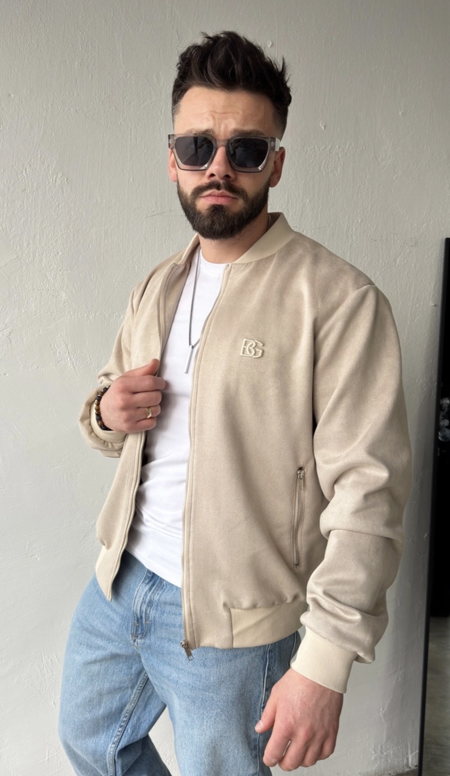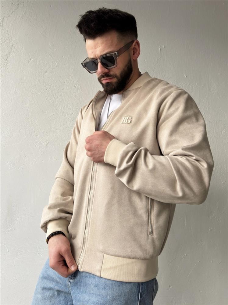 Pánska semišová bunda BG ERA. Klasická pánska bomber bunda so zapínaním na zips. Dve predné vrecká, tiež so zipsom. Lem bundy, manžety a golier sú zakončené bavlneným rebrovaním. Logo BG Brandenburg Couture je vyšívané na srdci z látky tón v tóne.