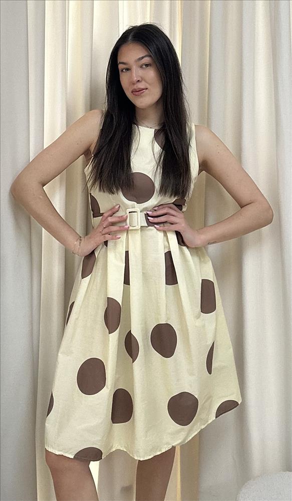 Krátke áčkové šaty bez rukávov sú zdobené výrazným bodkovaným vzorom v kontrastnom hnedom odtieni. Majú čistý, minimalistický strih s okrúhlym výstrihom, ktorý pôsobí moderne a nadčasovo. Dominantným prvkom je opasok v rovnakom materiáli s výraznou prackou, ktorý krásne zvýrazňuje pás a vytvára lichotivú siluetu. Ľahký a príjemný materiál zabezpečuje pohodlné nosenie počas teplejších dní, zatiaľ čo rozšírená sukňa dodáva šatám hravosť a voľnosť pohybu. Ideálna voľba na letné dni, mestské prechádzky či neformálne spoločenské príležitosti.